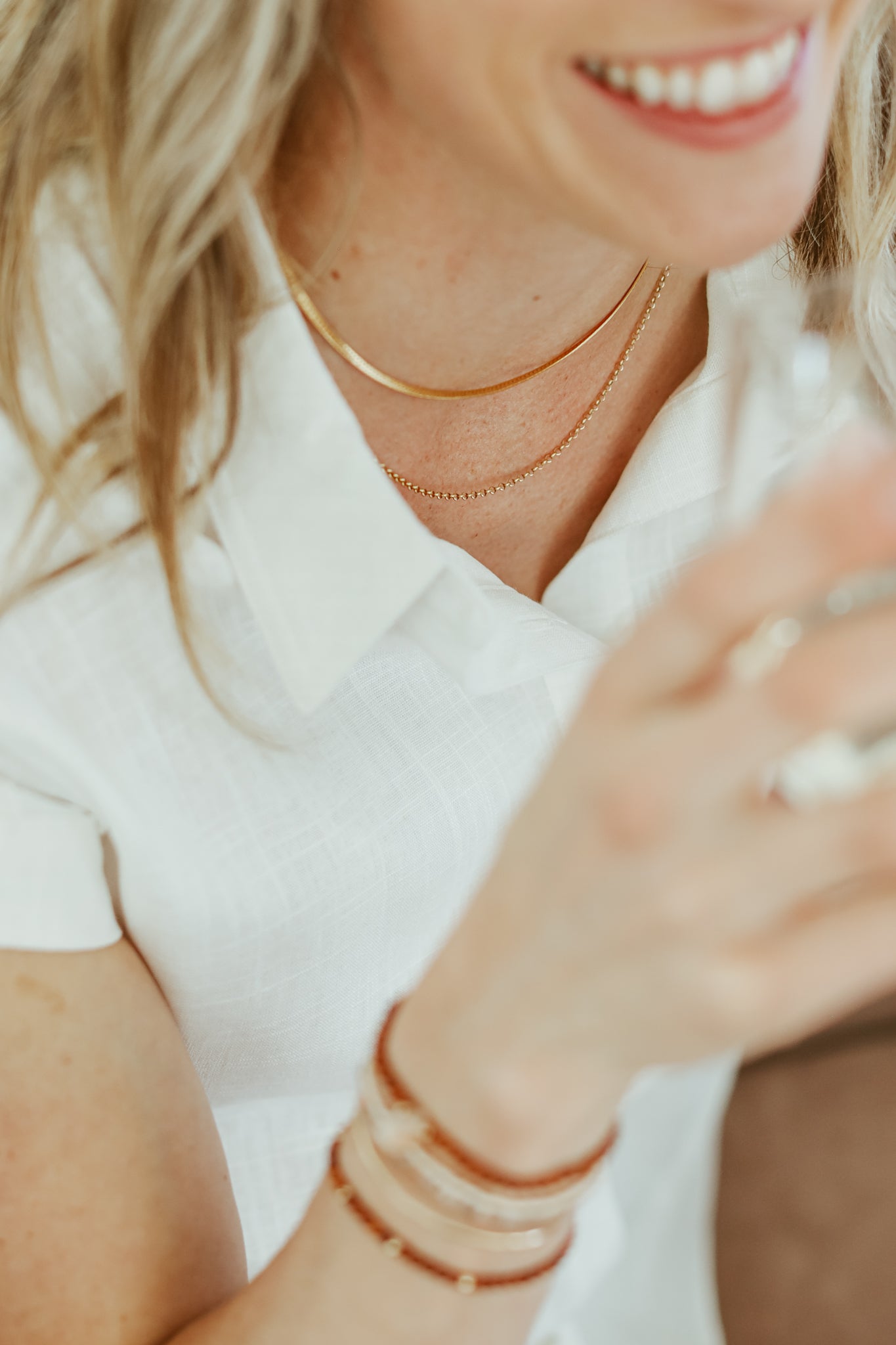 Gold-filled metal is a high quality alternative to real gold. It is fused to a base metal, and is 100x thicker than gold plating, which will eventually tarnish and/or color your skin. If stored and cared for properly, gold-filled jewelry is a durable + economical option that can last a lifetime!